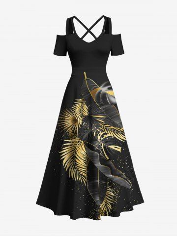 Plus Size Metallic Tropical Leaf Print Cold Shoulder Crisscross Hawaii Maxi Dress - Black - 3x