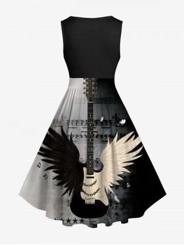 Plus Size Musical Festival Guitar Wings Music Notes Print 1950s Vintage Dress - Black - M