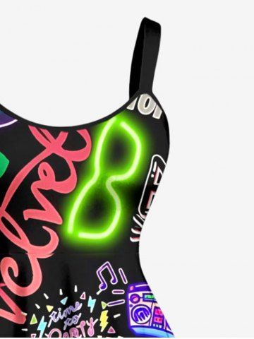 Plus Size Neon Funny Letters Music Print Hawaii A Line Dress - Black - Xs