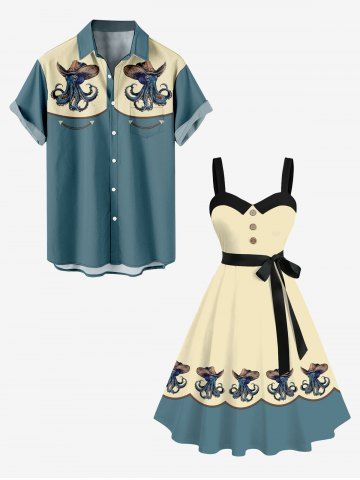 Graphic Dresses > Plus Size Octopus Hat Colorblock Print Buttons Turn Down Collar Hawaii Dress With Belt