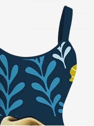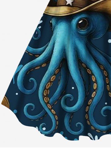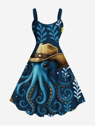 Plus Size Octopus Hat Leaf Branch Print Hawaii A Line Dress - Deep Blue - 4x