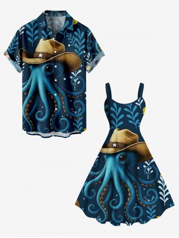 Plus Size Octopus Hat Leaf Branch Print Hawaii A Line Dress - Deep Blue - 6x