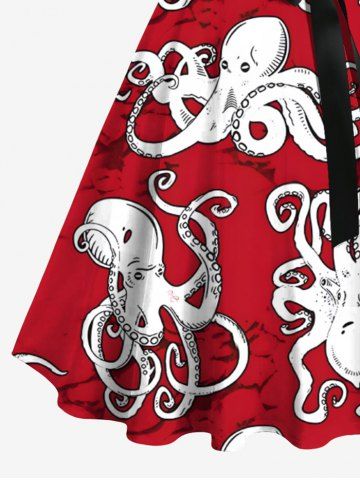 Plus Size Octopus Print Hawaii Button A Line Dress with Removable Belt - Red - 1x