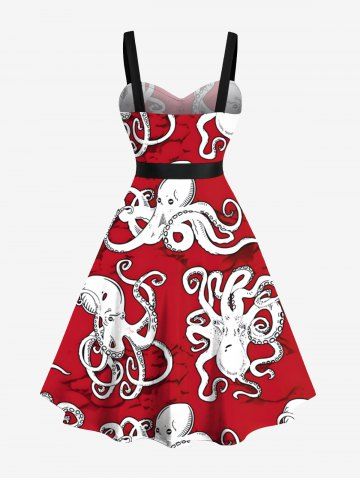 Plus Size Octopus Print Hawaii Button A Line Dress with Removable Belt - Red - 5x