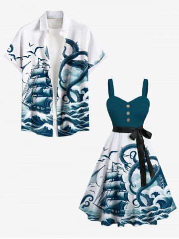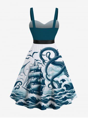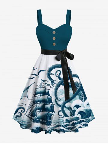 Plus Size Octopus Sailboat Sea Waves Bird Print Hawaii Cruise Button A Line Dress with Removable Belt - Deep Green - S