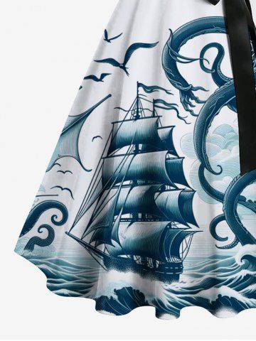 Graphic Dresses > Plus Size Octopus Sailboat Sea Waves Bird Print Hawaii Cruise Button A Line Dress with Removable Belt