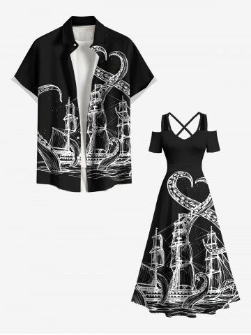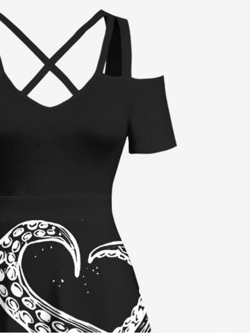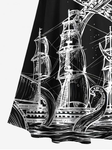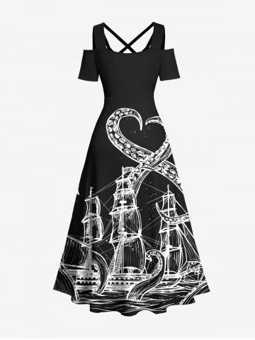 Plus Size Octopus Sailboat Sea Waves Print Hawaii Cruise Cold Shoulder Crisscross A Line Maxi Dress - Black - 1x