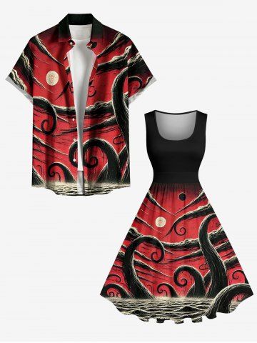 Plus Size Octopus Sea Moon Print Hawaii Swing A Line Dress - Red - 4x