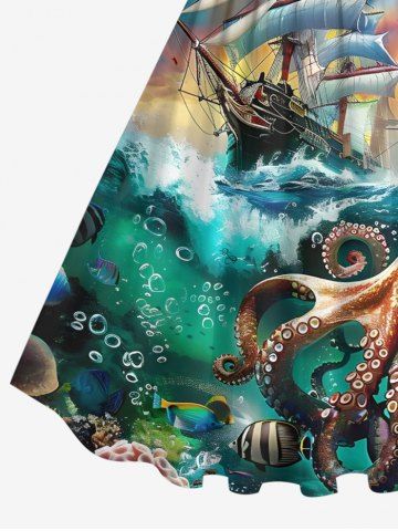 Graphic Dresses > Plus Size Octopus Sea Waves Sailboat Ombre Sky Print Hawaii Cruise Vintage 1950s Swing A Line Dress