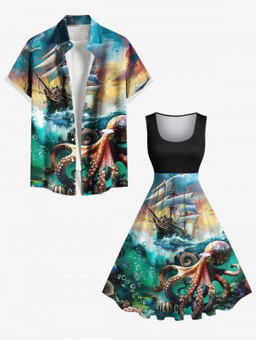Graphic Dresses > Plus Size Octopus Sea Waves Sailboat Ombre Sky Print Hawaii Cruise Vintage 1950s Swing A Line Dress