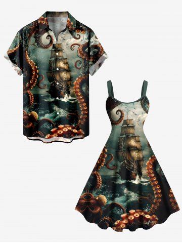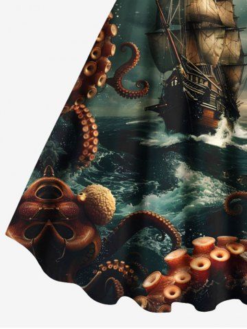 Graphic Dresses > Plus Size Octopus Ship Sea Wave Crusie Print Hawaii Tank Dress
