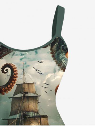 Plus Size Octopus Ship Sea Wave Crusie Print Hawaii Tank Dress - Deep Green - L