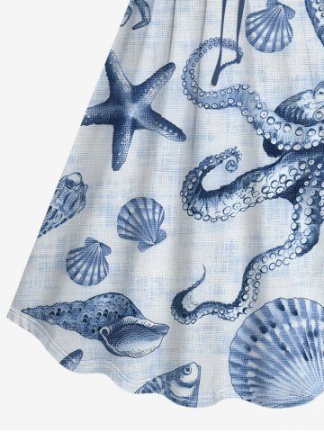 Plus Size Octopus Starfish Shell Crab Print Cinched Hawaii Dress - Blue - Xs