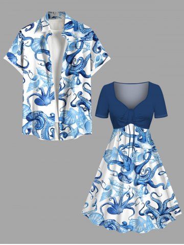 Plus Size Octopus Starfish Shell Print Cinched Hawaii Dress - Blue - L