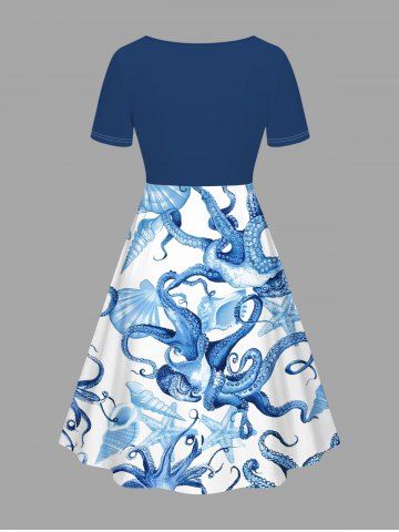 Plus Size Octopus Starfish Shell Print Cinched Hawaii Dress - Blue - 1x