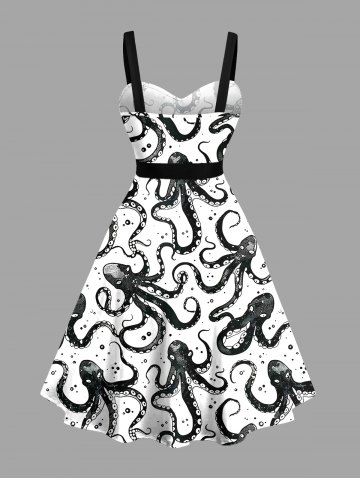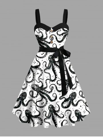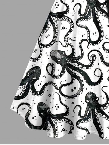 Graphic Dresses > Plus Size Octopus Two Tone Print Buttons Turn Down Collar Hawaii Dress With Belt