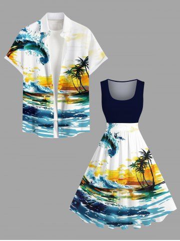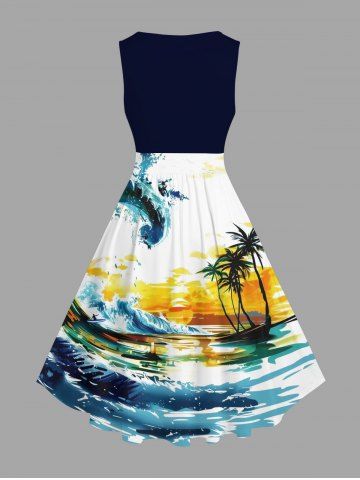 Graphic Dresses > Plus Size Oil Painting Coconut Tree Sea Waves Sunset Print Hawaii 1950s Vintage Dress
