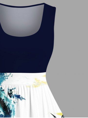 Plus Size Oil Painting Coconut Tree Sea Waves Sunset Print Hawaii 1950s Vintage Dress - Black - 3x