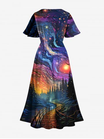 Graphic Dresses > Plus Size Oil Painting Galaxy Moon Trees Bridge Print Split Hawaii Midi Dress