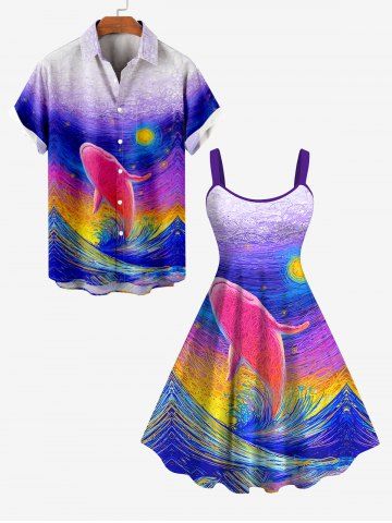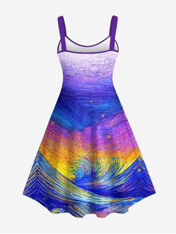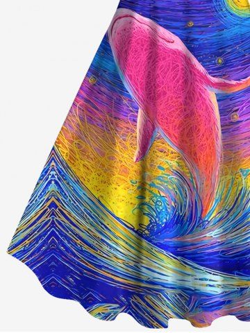 Graphic Dresses > Hawaii Plus Size Oil Painting Sea Creatures Wave Sun Shark Print Tank Dress