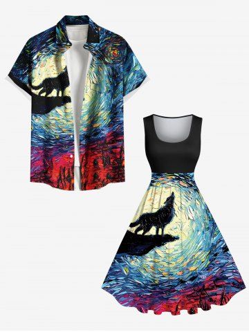 Graphic Dresses > Plus Size Oil Painting Wolf Moon Swirls Print 1950s Vintage Hawaii Dress
