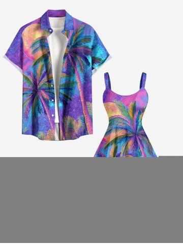 Plus Size Ombre Coconut Tree Moon Print Hawaii A Line Dress - Light Purple - M
