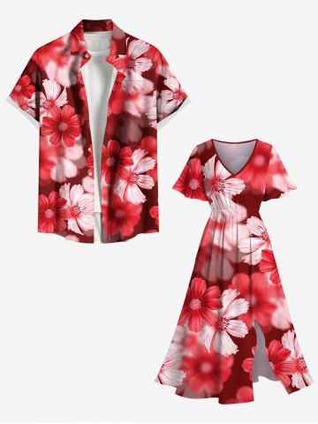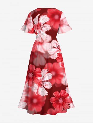 Plus Size Ombre Daisy Flower Print Hawaii Split Pocket A Line Midi Dress - Red - M