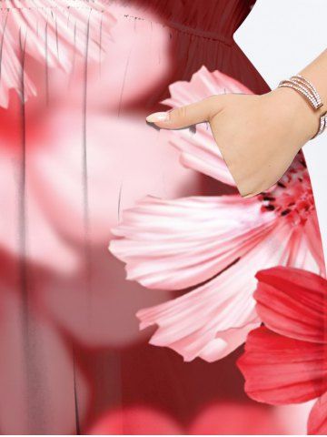 Plus Size Ombre Daisy Flower Print Hawaii Split Pocket A Line Midi Dress - Red - L