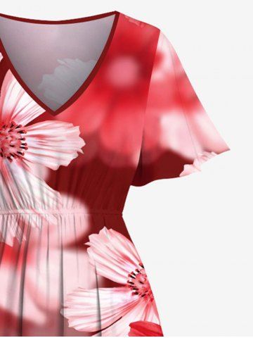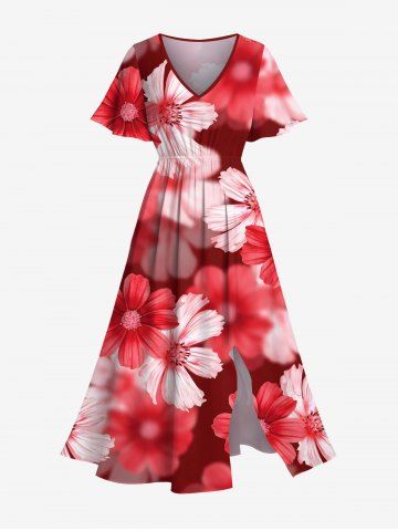 Plus Size Ombre Daisy Flower Print Hawaii Split Pocket A Line Midi Dress - Red - 4x
