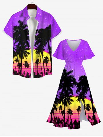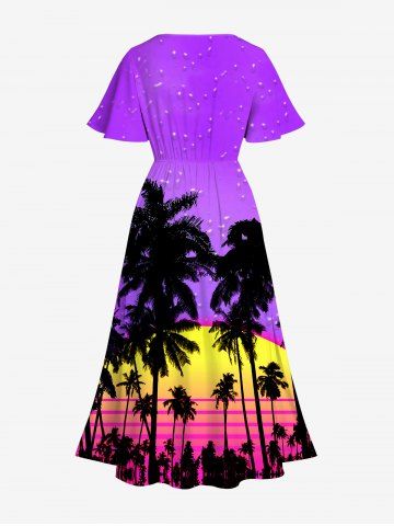 Plus Size Ombre Dusk Galaxy Coconut Tree Print Hawaii Split A Line Dress - Purple - 1x