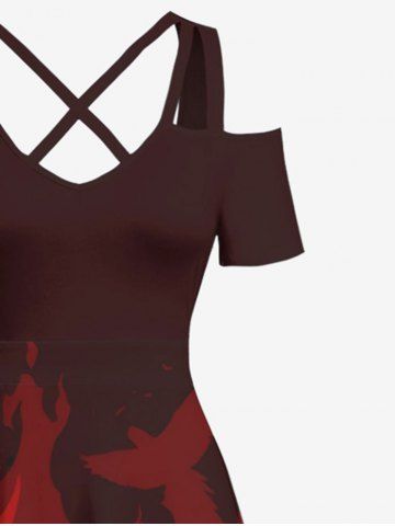 Plus Size Ombre Fire Flame Print Cold Shoulder Crisscross A Line Maxi Dress - Red - S