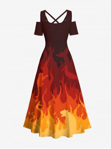 Graphic Dresses > Plus Size Ombre Fire Flame Print Cold Shoulder Crisscross A Line Maxi Dress