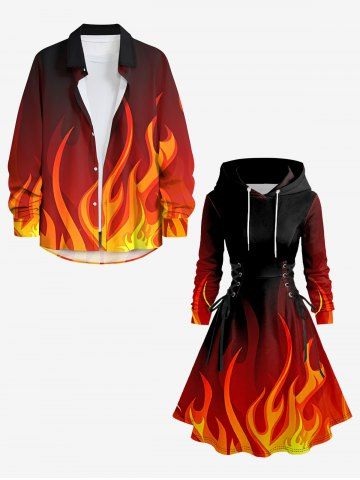 Graphic Dresses > Plus Size Ombre Fire Flame Print Lace Up Hooded A Line Long Sleeves Dress