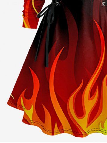 Graphic Dresses > Plus Size Ombre Fire Flame Print Lace Up Hooded A Line Long Sleeves Dress