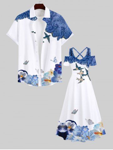 Plus Size Ombre Floral Butterfly Bird Print Hawaii Crisscross A Line Maxi Dress - White - S