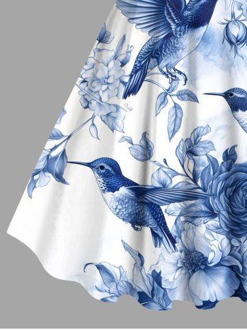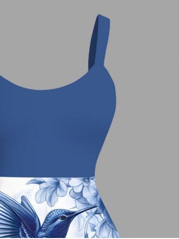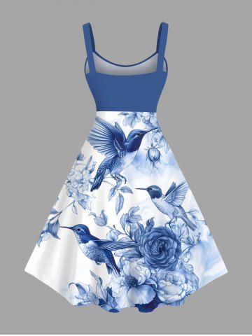 Plus Size Ombre Floral Leaves Bird Print Hawaii A Line Tank Dress - Blue - 6x