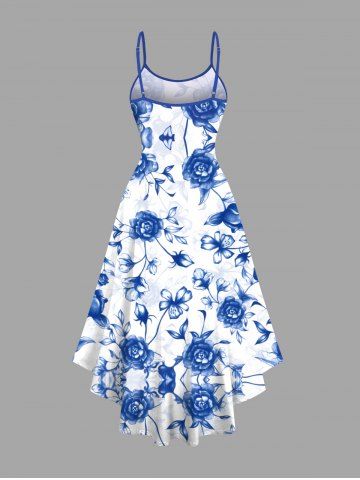 Plus Size Ombre Flower Leaf Branch Print Hawaii High Low Asymmetric Cami Dress - Blue - 3x
