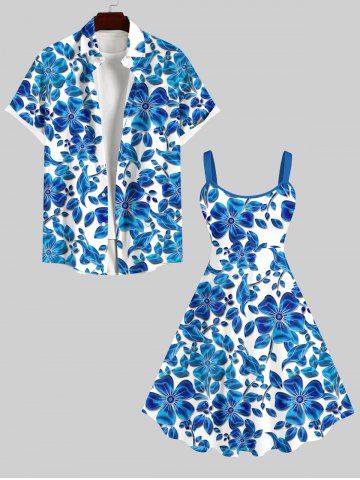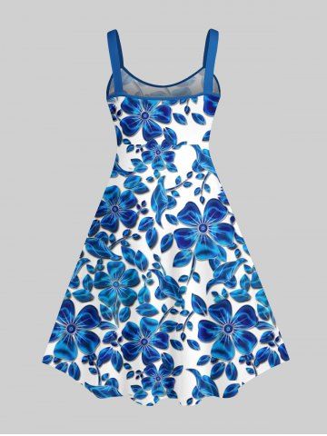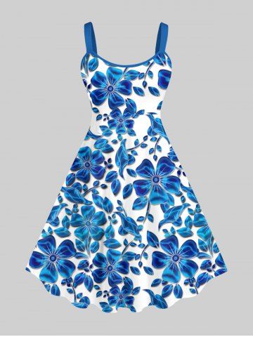 Plus Size Ombre Floral Leaves Print Hawaii A Line Tank Dress - Blue - Xs