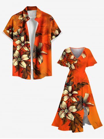 Plus Size Ombre Flower Leaf Print Hawaii Split Pocket A Line Midi Dress - Orange - 6x