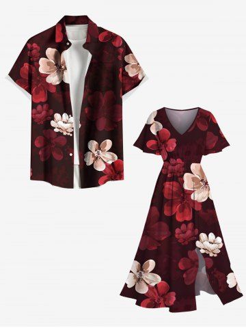 Plus Size Ombre Floral Print Hawaii Split Pocket A Line Midi Dress - Deep Red - L
