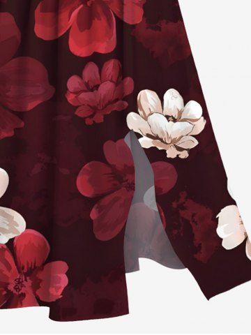 Plus Size Ombre Floral Print Hawaii Split Pocket A Line Midi Dress - Deep Red - 6x