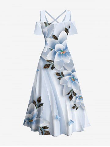 Plus Size Ombre Flower Leaf Butterfly Print Hawaii Cold Shoulder Crisscross A Line Maxi Dress - Powder Blue - 6x