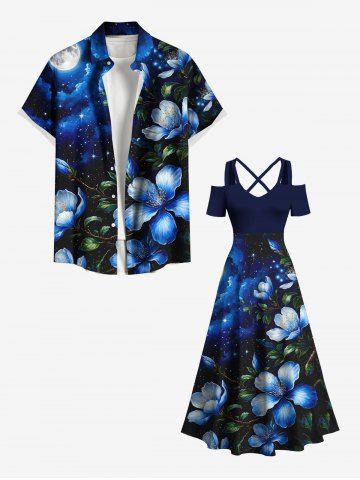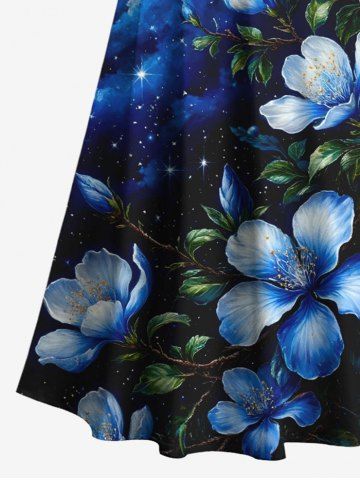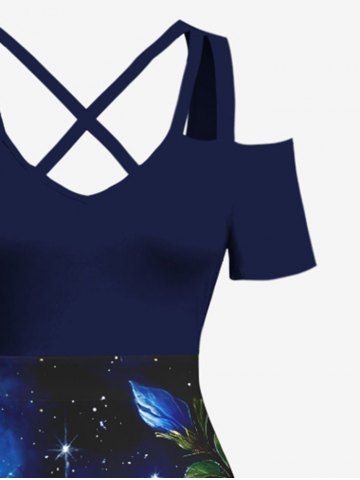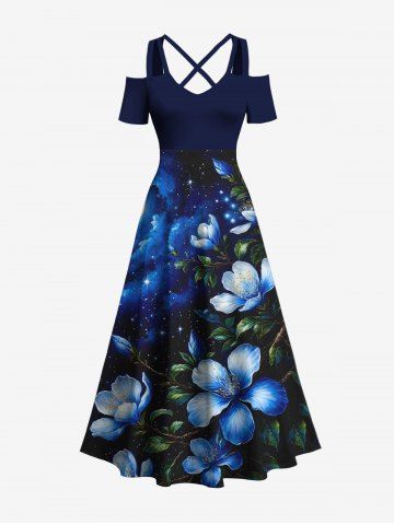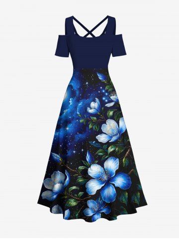 Graphic Dresses > Plus Size Ombre Flower Leaf Glitter Galaxy Print Hawaii Cold Shoulder Crisscross A Line Maxi Dress