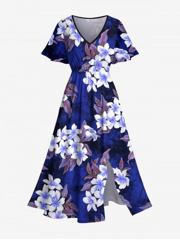 Plus Size Ombre Flower Leaf Print Hawaii Split Pocket A Line Midi Dress - Navy Blue - Xxs