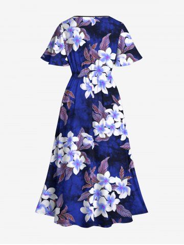 Plus Size Ombre Flower Leaf Print Hawaii Split Pocket A Line Midi Dress - Navy Blue - S