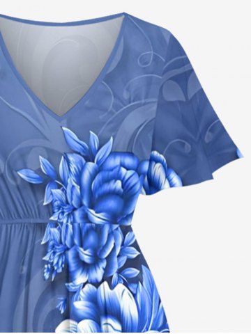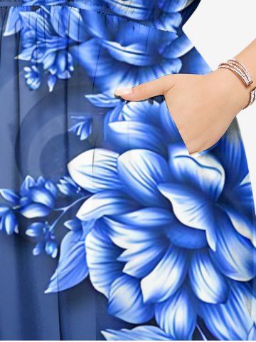 Plus Size Ombre Flower Leaf Print Hawaii Split Pocket A Line Midi Dress - Blue - Xxs