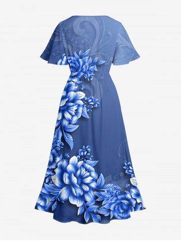 Plus Size Ombre Flower Leaf Print Hawaii Split Pocket A Line Midi Dress - Blue - Xs
