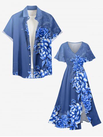 Plus Size Ombre Flower Leaf Print Hawaii Split Pocket A Line Midi Dress - Blue - 4x