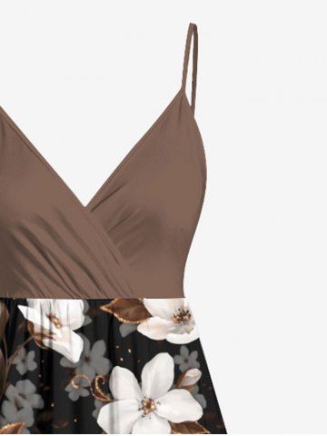Plus Size Ombre Flower Leaf Print Surplice A Line Cami Dress - Coffee - S