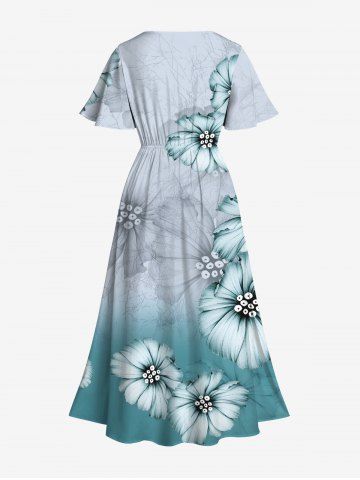 Plus Size Ombre Flower Print Hawaii Split Pocket A Line Midi Dress - Light Gray - 5x